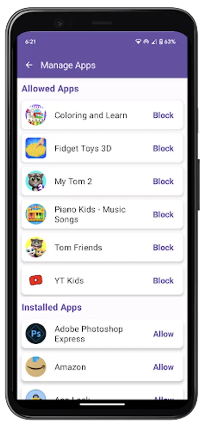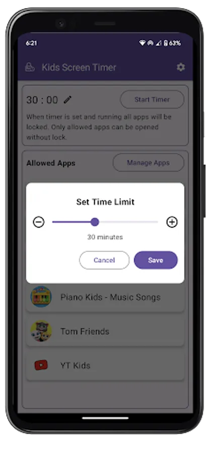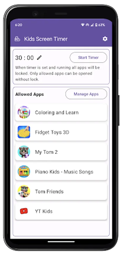 Kids screen timer is simple app using this you can set time limit and select apps which is allowed for your kids.