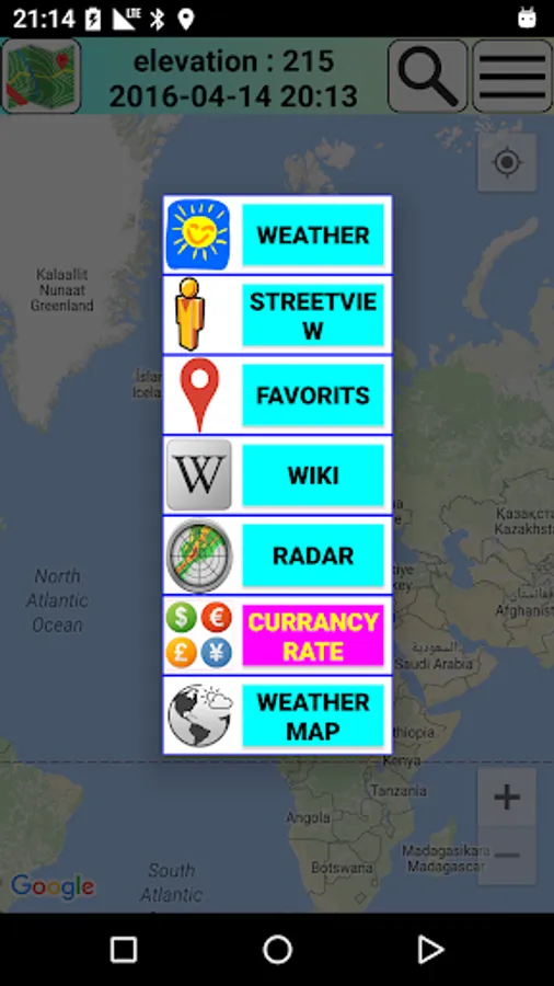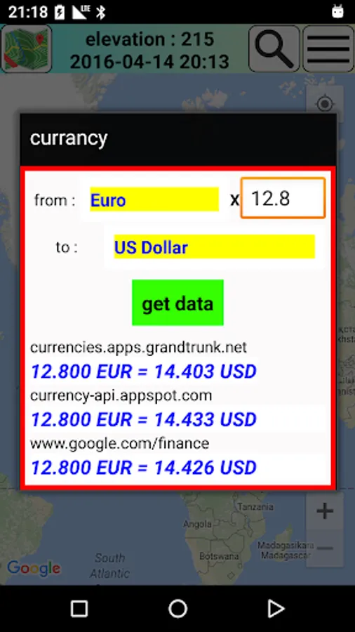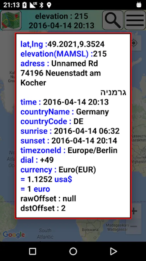 Geo data like elevation , time, sunrise, sunset, country, currency