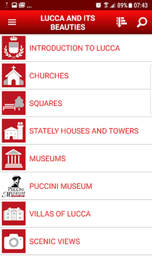 Within the section "Lucca and His beauty" you can see "The Story of Lucca photos and exclusive historical Movies", categories such as "Churches", "Squares", "Palaces and Towers", "Museum" and "Panoramic" .