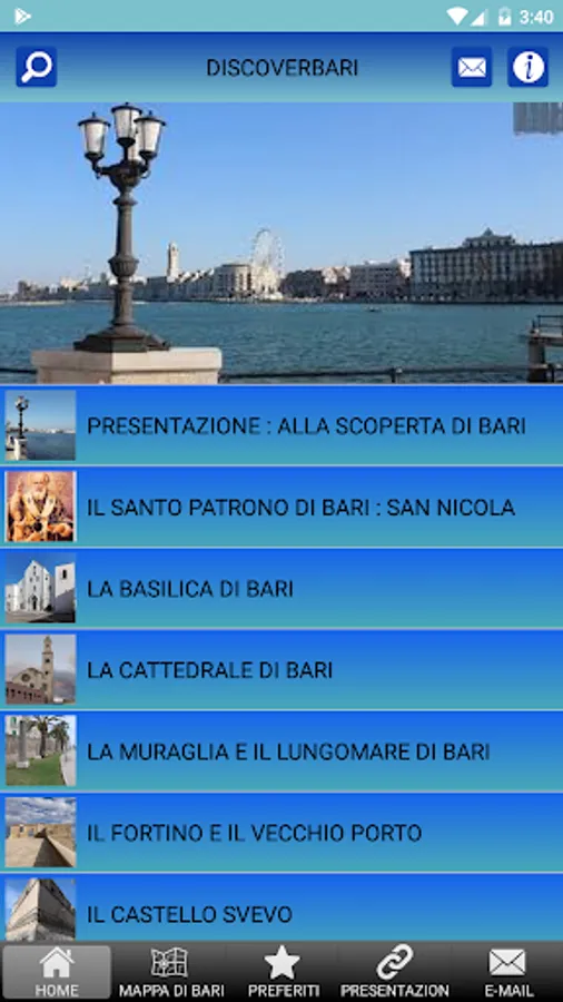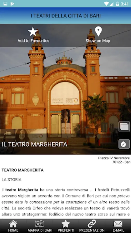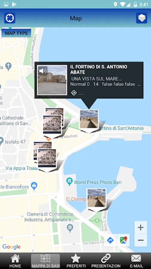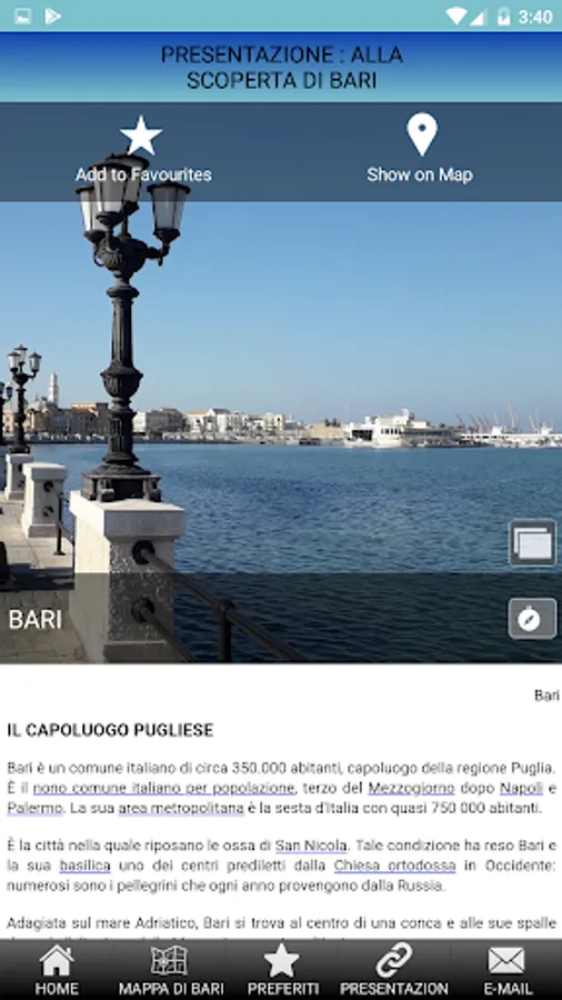 MAIN ELEMENTS: A SMALL TOURIST GUIDE FOR BARI, PHOTO GALLERY, DESCRIPTIONS, MAPS WITH THE MAIN MONUMENTS OF HISTORICAL INTEREST, POSSIBILITY TO CHOOSE PLACES IN FAVORITES.