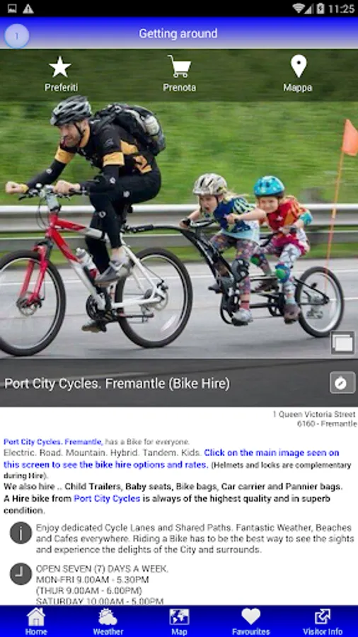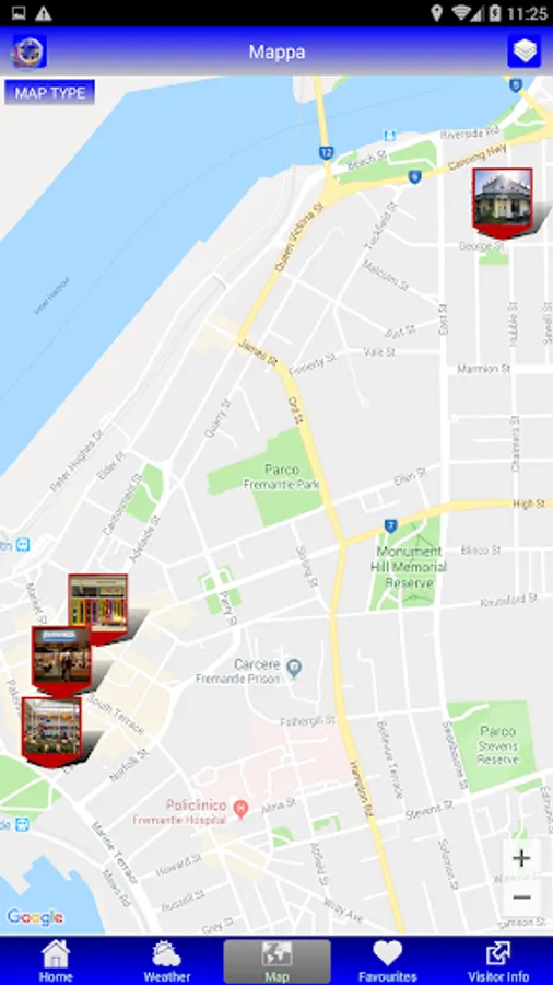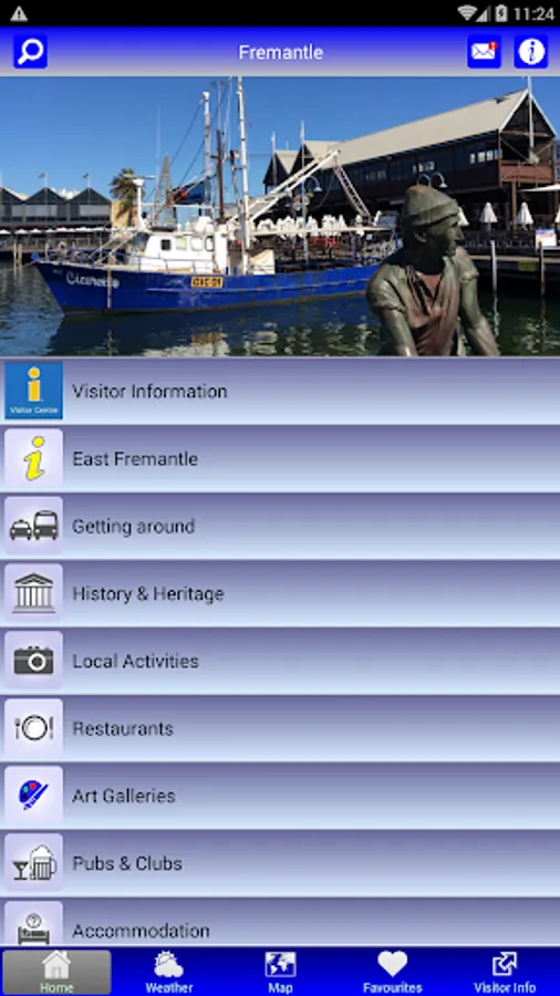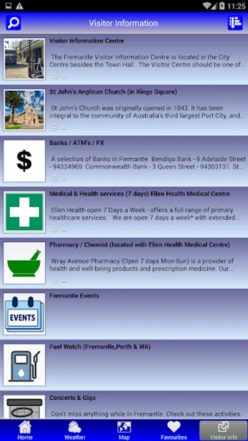The Fremantle Map App integrates with Google Maps online. Points of interest can be saved in a handy 'Favourites' list. Your current location in Fremantle and distance to a place of interest is marked. A search button can source information found within the Map App. A useful 4 day weather forecast is also provided.