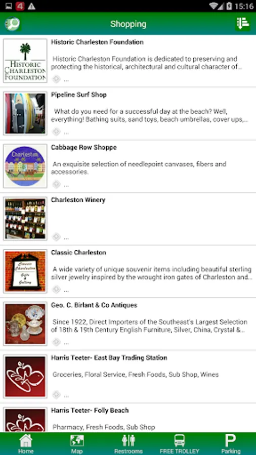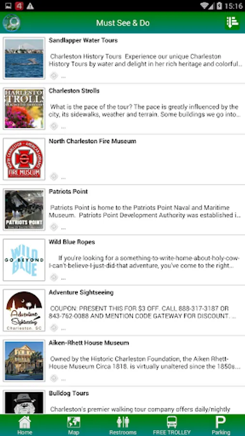 The perfect guide to historic Charleston, SC. This easy to use app guides you to the area's best attractions, plantations, sightseeing, tours, museums, dining, shopping, events and even tidal charts. GPS directions and COUPONS help you get the most out of your visit to the area. It is also extremely helpful in finding hard to find public parking and restrooms in the downtown historic area. Includes information on the Free Trolley transportation- DASH/CARTA that is available throughout the historic district.