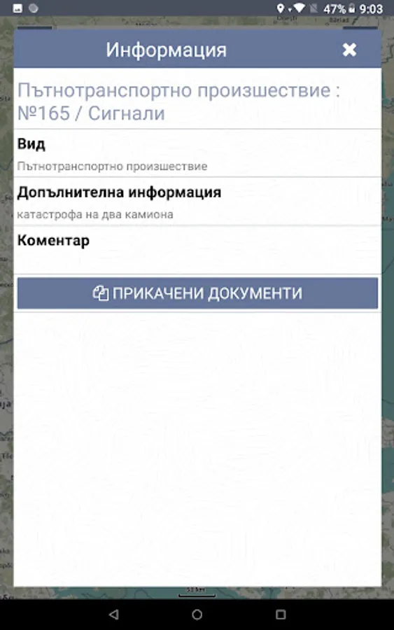 The application provides access to information related to different types of incidents (Floods, Fires, Landslides, Earthquakes and Road Traffic Accidents). Users can view published incident data (incident file) as well as report an incident. The application provides the ability to locate and visualize current users using IIP via mobile devices with GPS. Information about all incidents is visualized on a map, with search, selection and data review tools available.