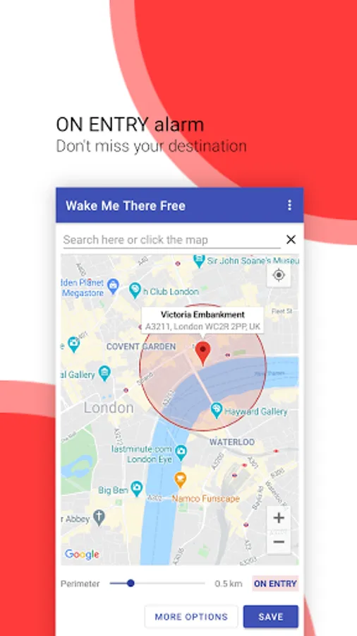 - On Entry alarm for all communters and travellers using public transport like trains, busses, trams etc.. Simply set a distance before your stop at which you want to be woken up.