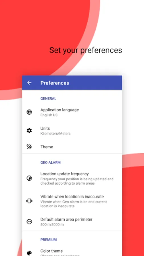 Language, Units, Light/Dark theme, Location update frequency, Default alarm area perimeter etc.