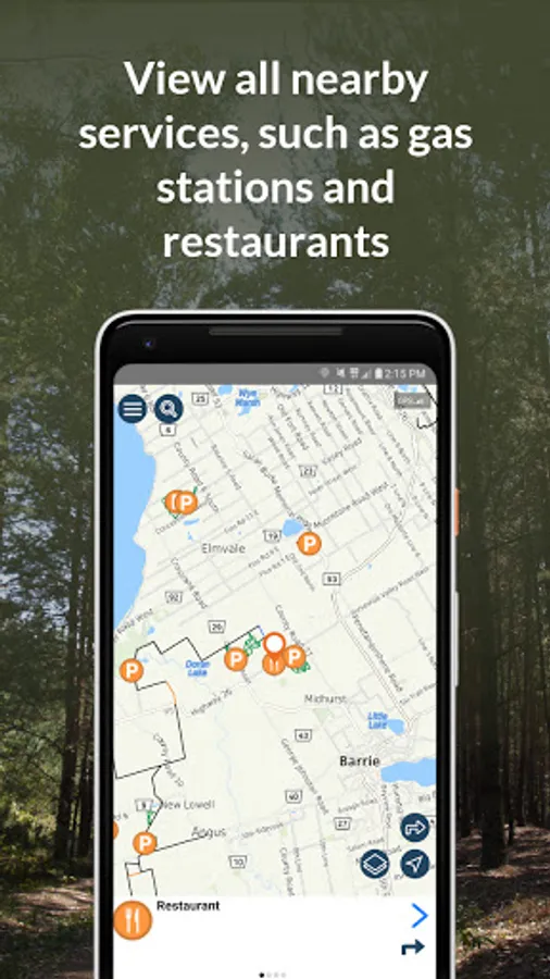► View nearby restaurants, gas stations, hotels, parking, and other services