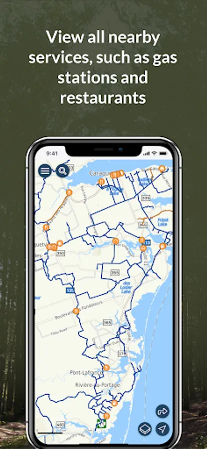 ► View nearby restaurants, gas stations, hotels, parking, and other services