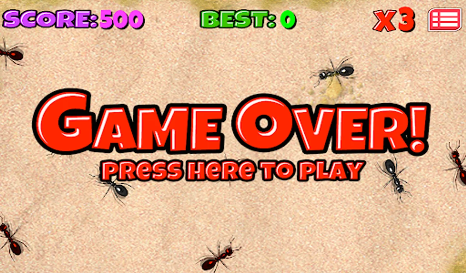 Avoid the red Ants! they are very very dangerous!, if you touch 3 red Ants your game is finished... Have fun with this amazing and funny Ant game.