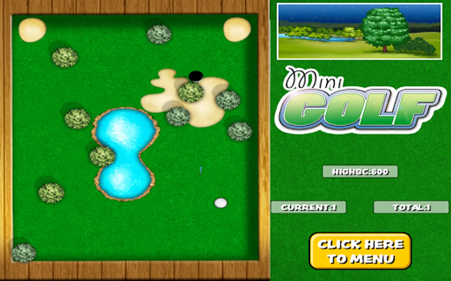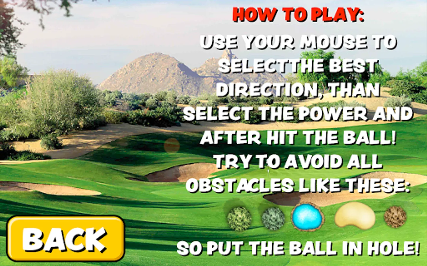 Avoid obstacles such as water, sand, trees etc ... find the shortest and easiest path to the green locate the flag and put the ball in the hole, just make sure you use the fewest possible shots, the game is very simple and very immediate suitable for children and the whole family.