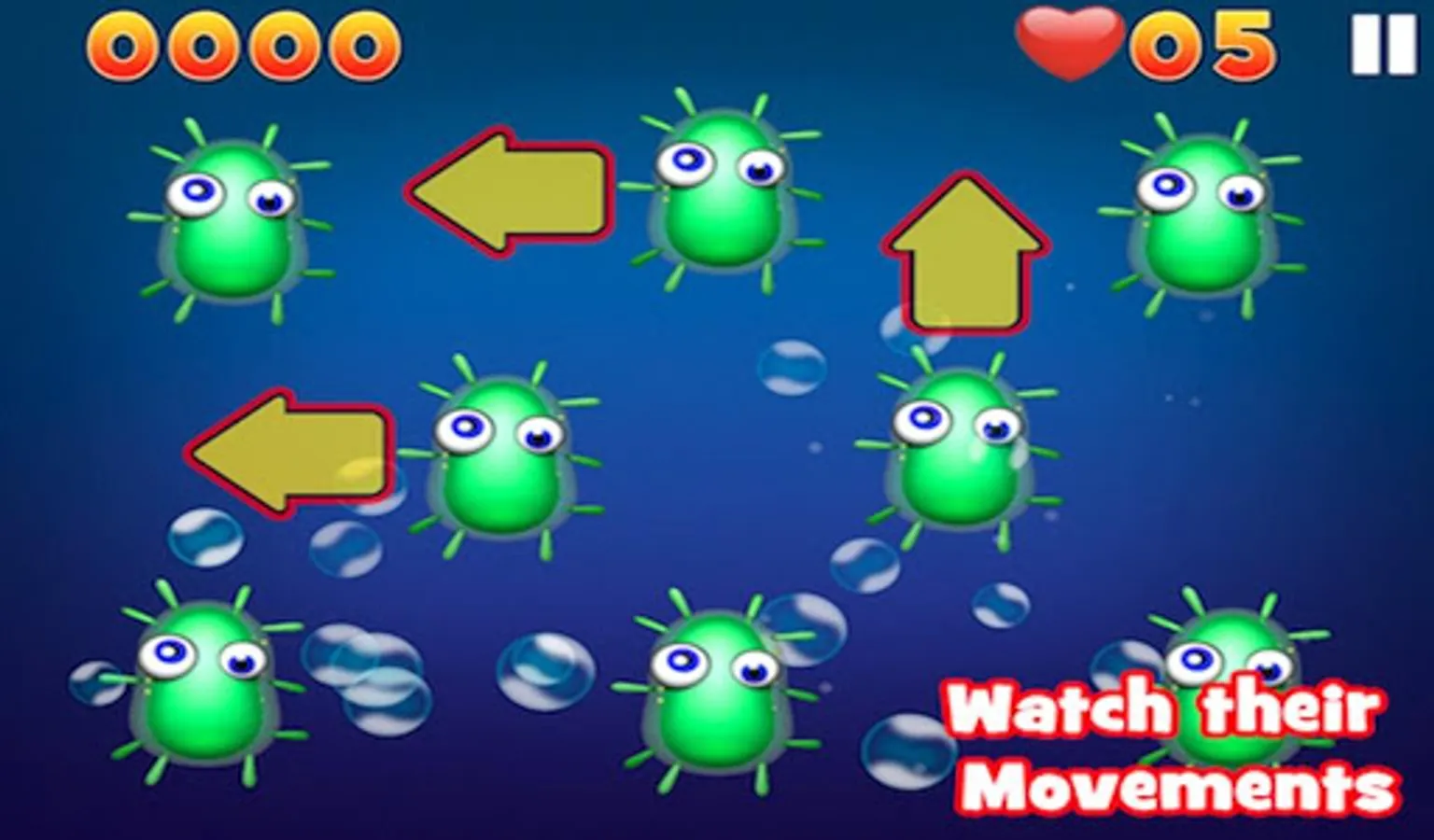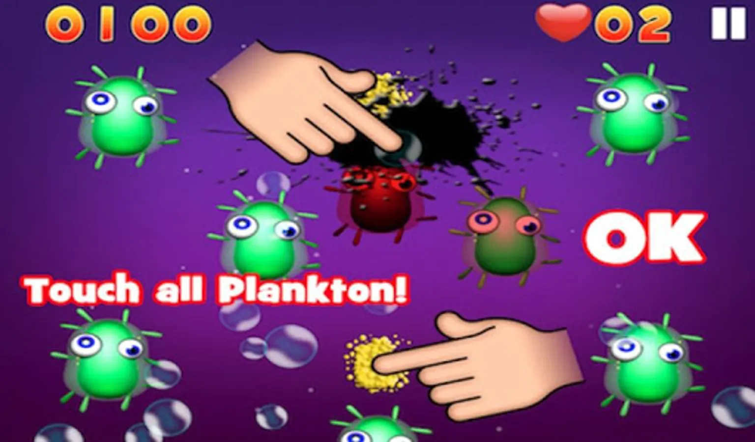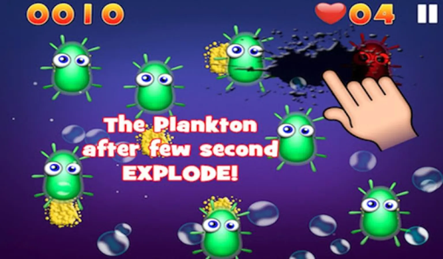 Collect all the plankton generated by the funny green creatures, be careful don't touch them or you'll lose a life!