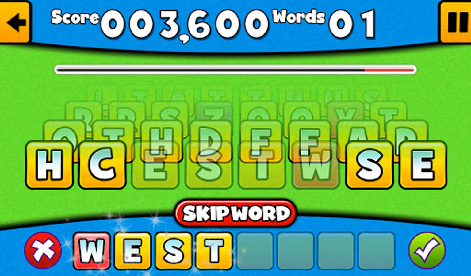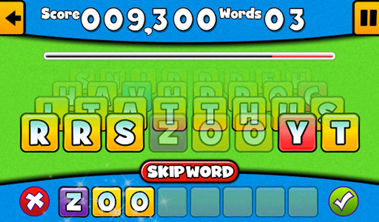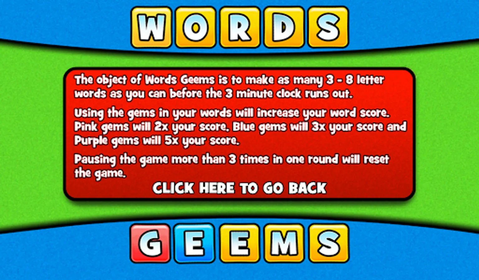 The objective of Words Geems is to make as many 3 - 8 letter words as you can before the 3 minute clock runs out. Using the gems in your words will increase your word score.