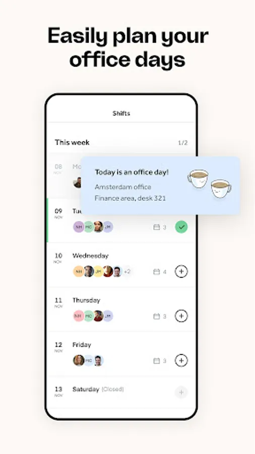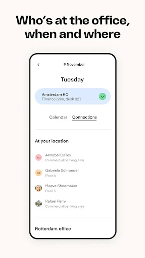 - View connected colleagues to see when and where they’ll be in the office