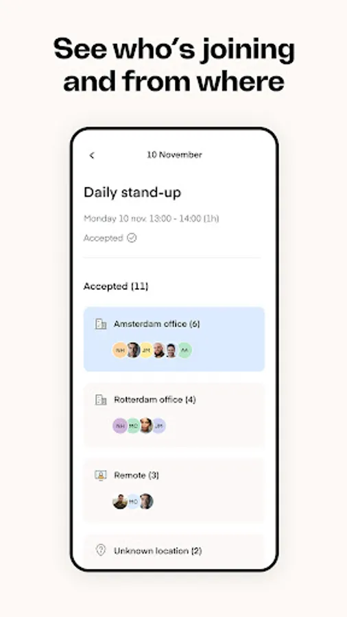 - Manage your hybrid meetings and see who'll be joining in-person or remotely