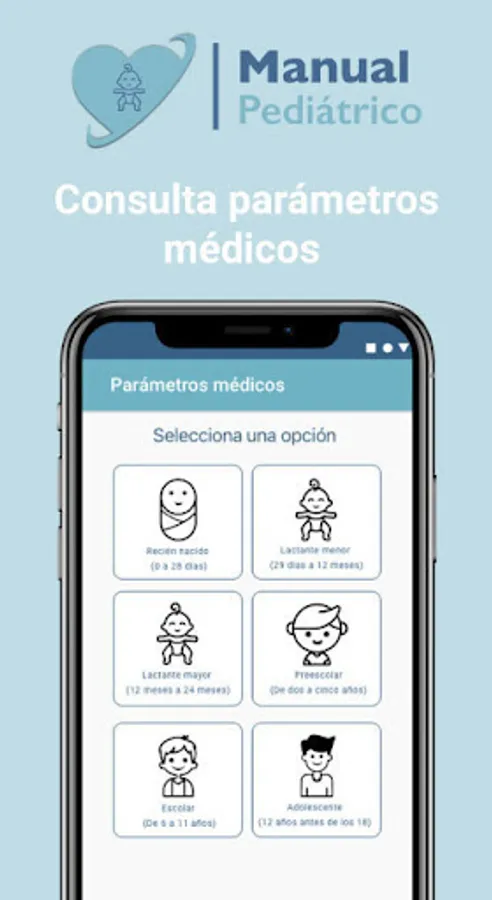 In Pediatric Manual you will find the section of medical parameters where you can filter by age range which is organized as follows: Newborn (zero to twenty-eight days), Minor infant (twenty-nine days to twelve months), Older infant (twelve months to 24 months), Preschool (From two to five years), School (From six to eleven years), Adolescent (Twelve years before eighteen).