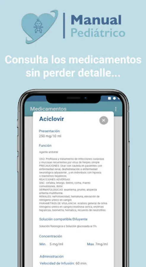 The clinical content that the Pediatric Manual has is accurate and is regularly updated, Professionals will be able to consult obtaining accurate and detailed information about the medications. Each drug will have a broad description and will show information such as: Type of presentation, Function, Compatible solution, Concentration, Administration, Infusion rate, Storage, Conditions, etc.