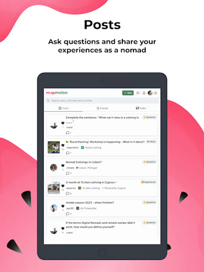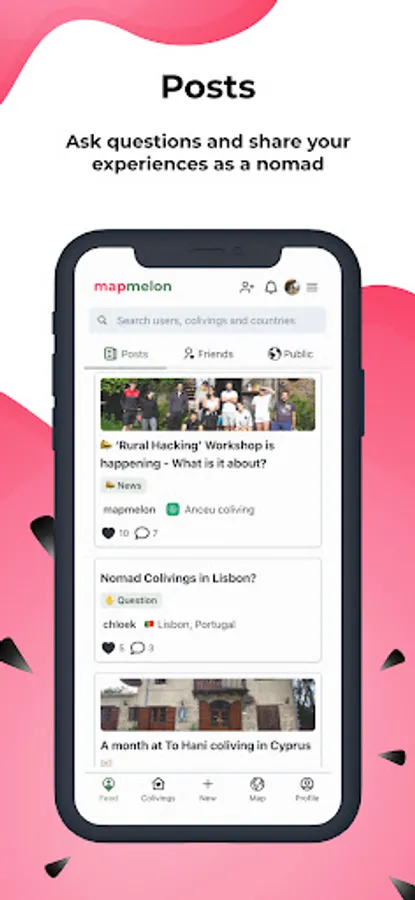 Keep track of your friends' plans, discover colivings, ask questions, and share your experiences as a nomad!