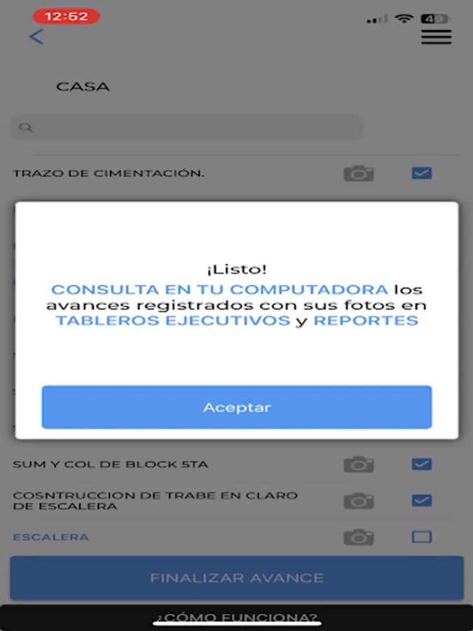 SPOT are made up of two platforms; WEB and APP. The WEB platform will take you by the hand to register your projects, the properties (if necessary) and the budget, review the progress of the work, approve and reject progress, information on the budget executed for each progress of the project, etc. On the other hand, with the APP (SPOT Avance) you can download the projects, go to the construction site, capture the progress and photographs without the need for internet. At the end of the advance; and making sure that you have an internet connection again, just click on the "Finish" button and all the information will be registered on the WEB platform.
