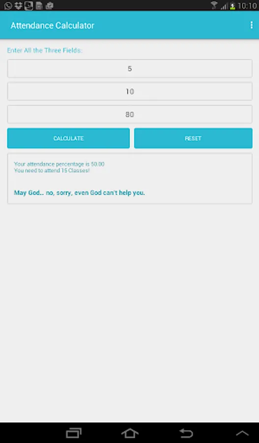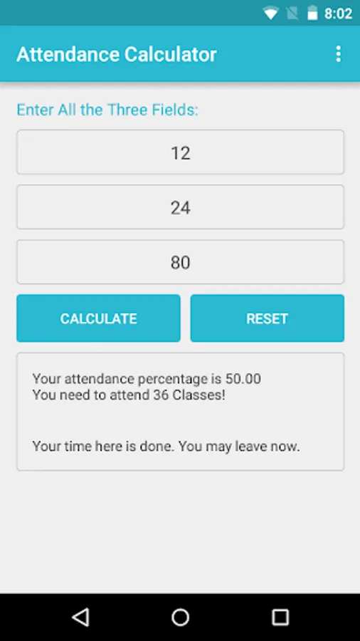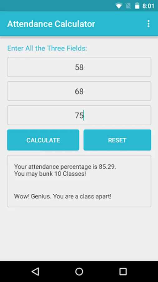 Attendance Calculator was developed by fellow-students tired of calculating how many days they could bunk or attend to maintain the attendance percentage. The tool gives you the option to enter your desired percentage. This could be the percentage required by your college or just a percentage you wish to maintain.