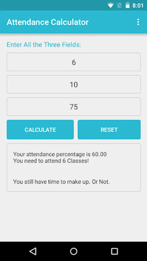 Attendance calculation is something most of dread and some of us love. But, no matter what you feel about it, Attendance calculation is something every student must do at some point in his academic life! So whether you are sitting in the class, bored & contemplating if you can afford to miss the next hour, or running late for class and thinking if it's alright to miss the lecture rather than bear the teacher's embarrassing comments, or if you are one of those who is too proud of your attendance in class and you just want to flaunt, this Attendance Calculator app is perfect for you.