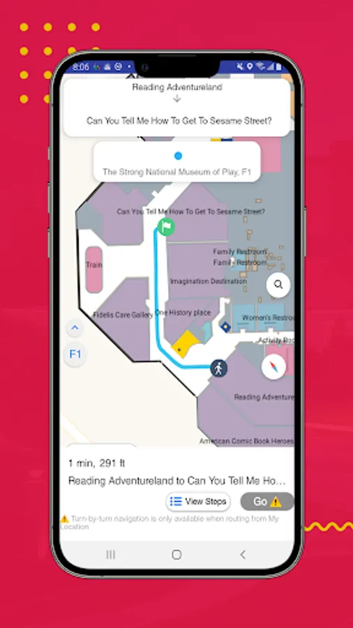 The Strong Museum Indoor Map will provide step-by-step directions throughout its exhibits and public spaces. Guests may view the indoor maps, search for a specific exhibit or space, and navigate to a selected destination. The “Blue Dot” representing the guest’s current location helps guide them from their point of origin to their destination.