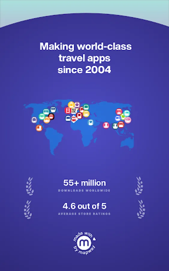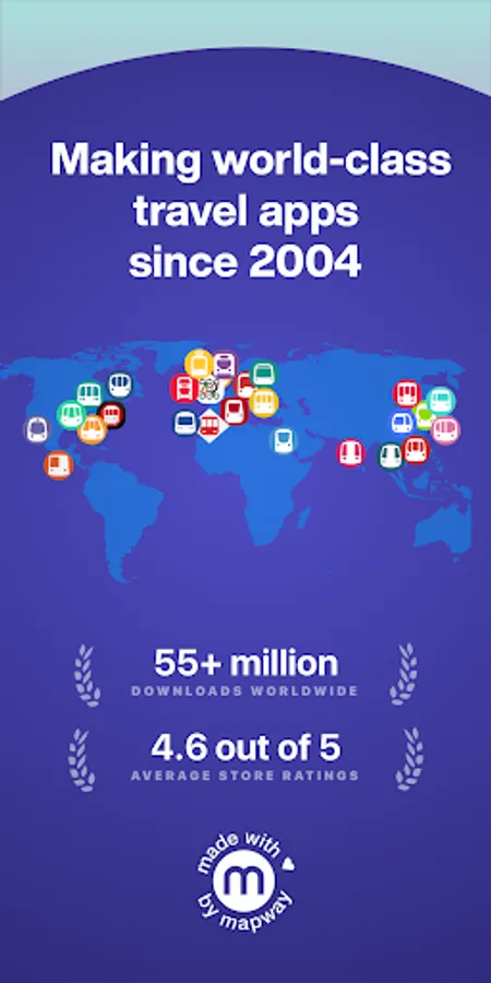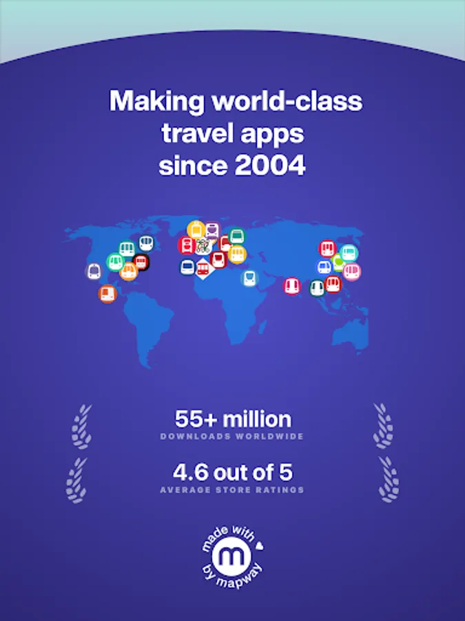 With over 15 years of experience, we have over 55 million downloads and hundreds of thousands of five star ratings across all our apps. Our users love us for our transit apps, check out our world-famous Tube Map London, New York Subway Map, and Paris Metro Map apps too. Just search Mapway π