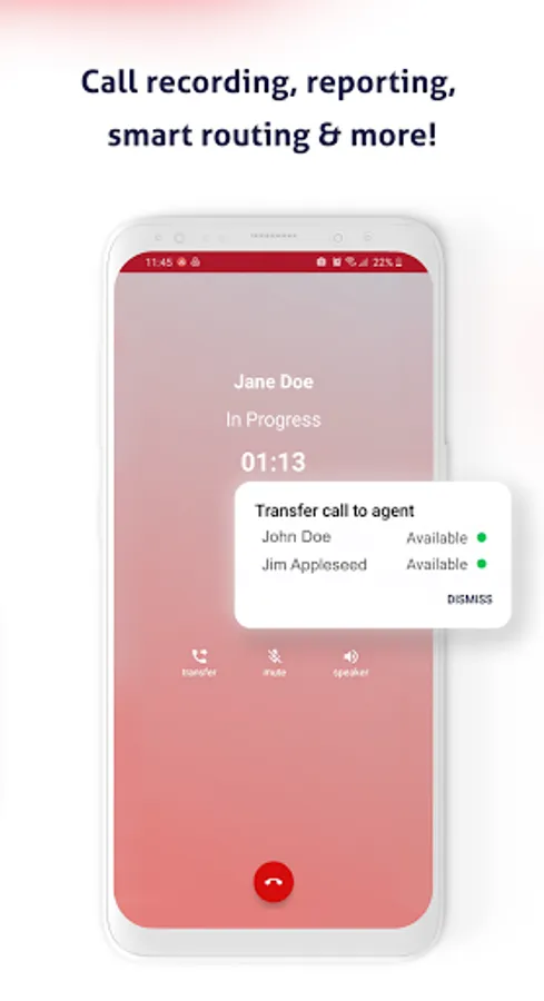Easily transfer calls between online agents with a click of a button. You can also transfer to the most qualified teammate. Know who's available and who's not before transferring the call.