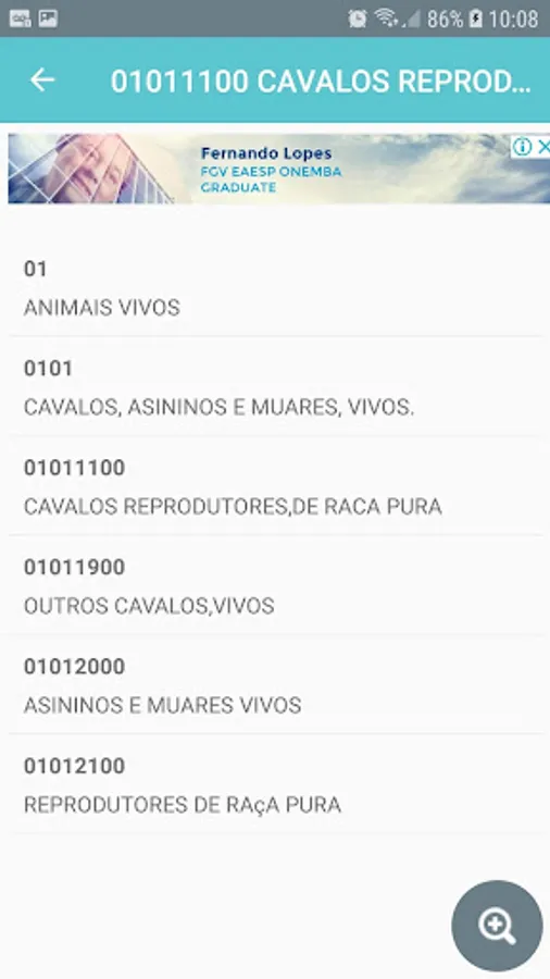 When selecting 0101.11.00 - HORSE BREEDING, DE RACA PURA you see: