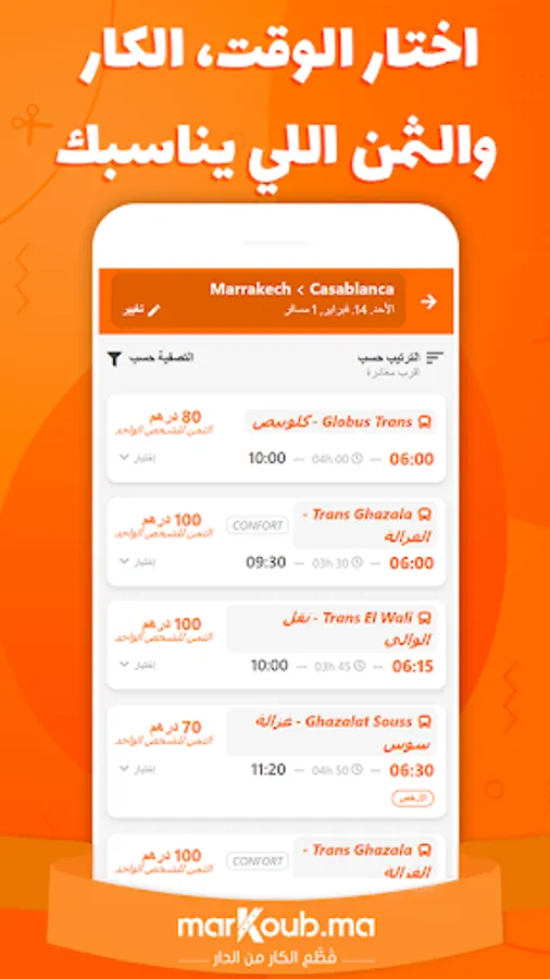 marKoub.ma is as easy as it is quick to use. All you have to do is enter the desired date as well as its departure and destination cities in order to obtain in real time the list of trips offered by the various companies serving the route (CTM, trans Tassaout, Globus, etc.)