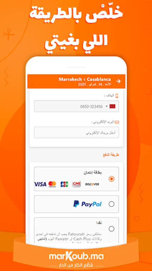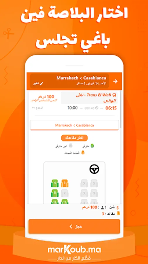Also select the seats where you want to sit and pay securely by credit card or in cash at a network of +1300 CashPlus or BaridCash branches throughout Morocco.