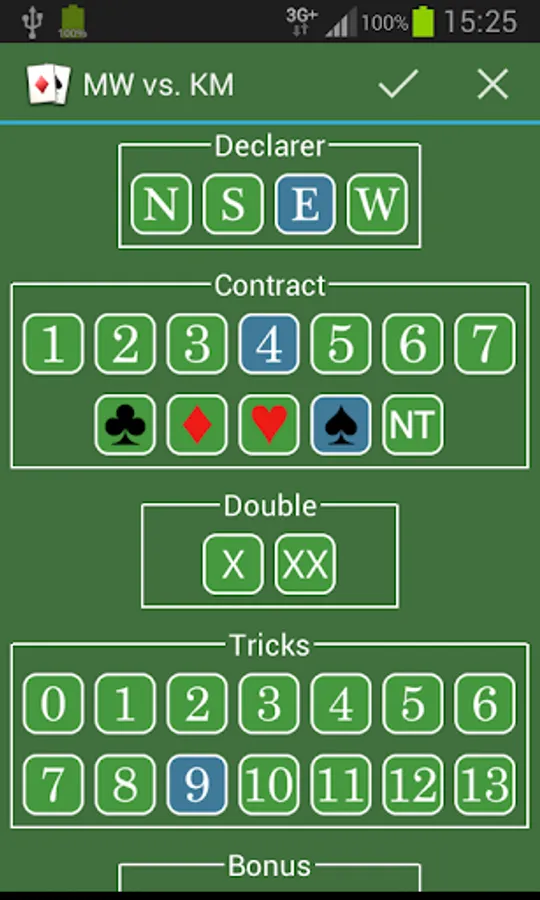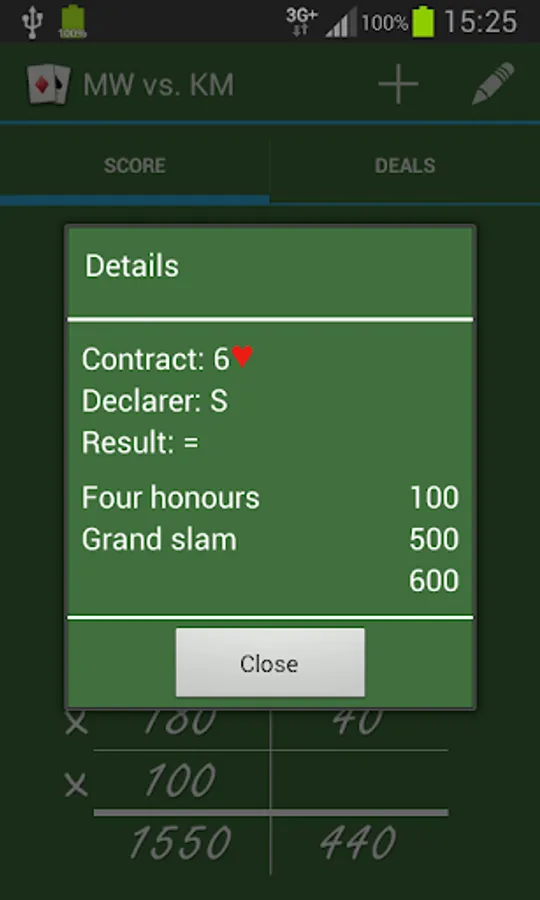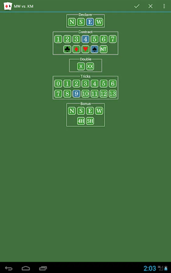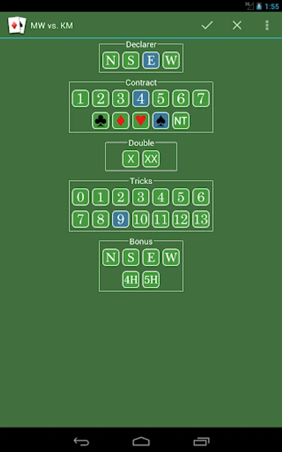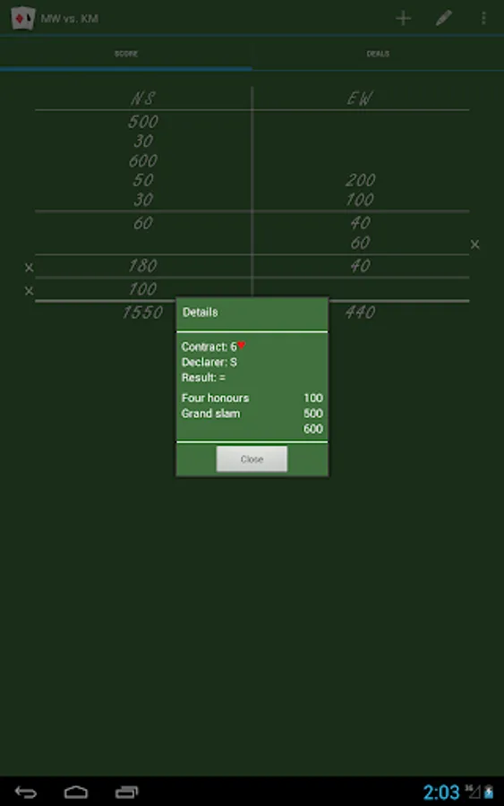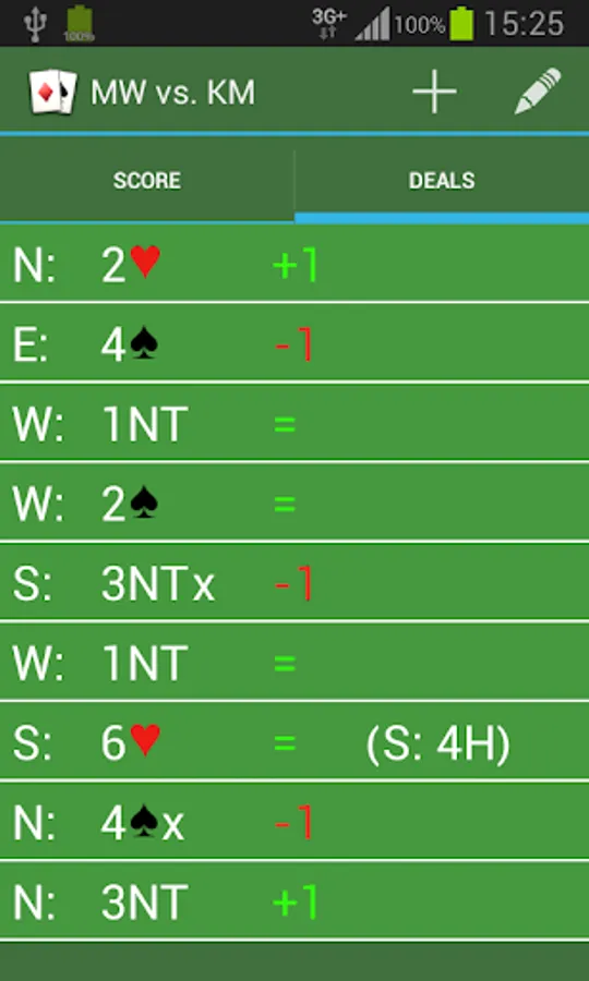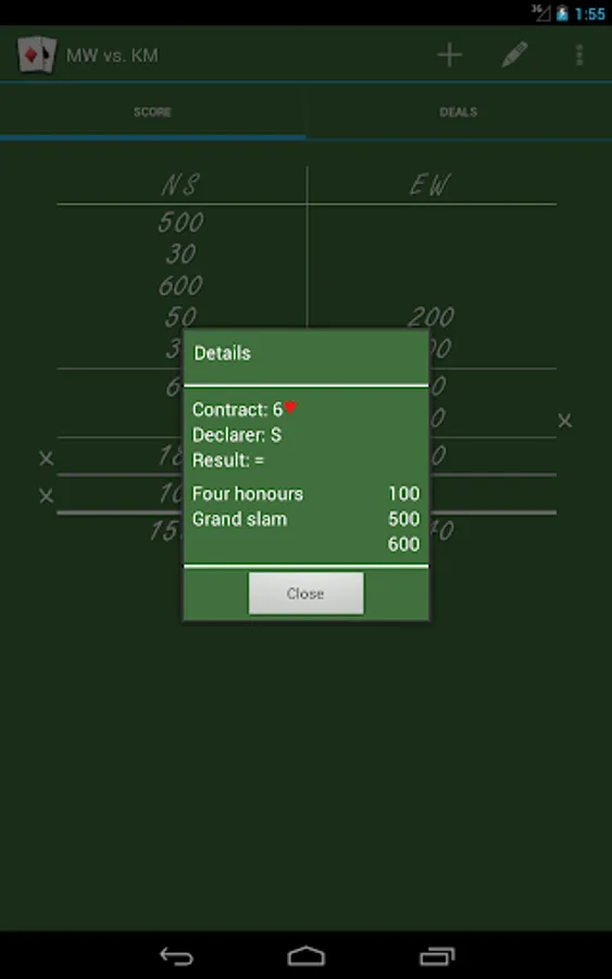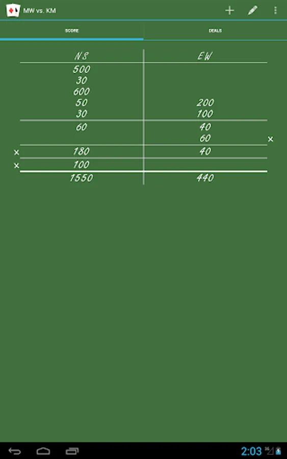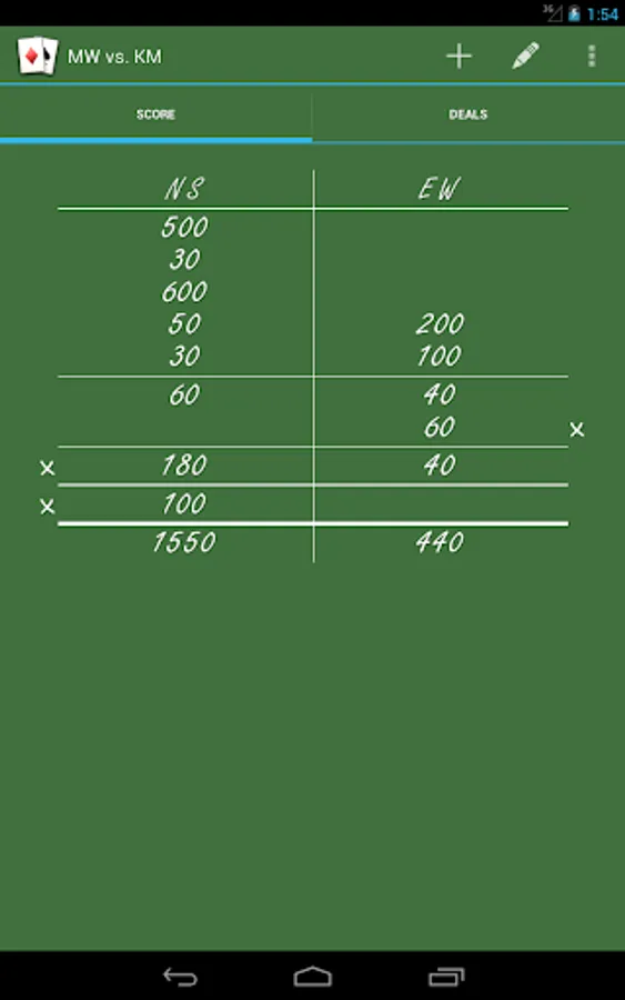 This application allows for scoring points in traditional rubber bridge ("above the line" and "below the line"). Just create a new game and add deals, providing a declarer, a contract, its result, and additional bonuses. The interface is very simple and intuitive, and there is also a help available. The application displays a score sheet in a form of a table. You can also switch to a list view of all deals.
