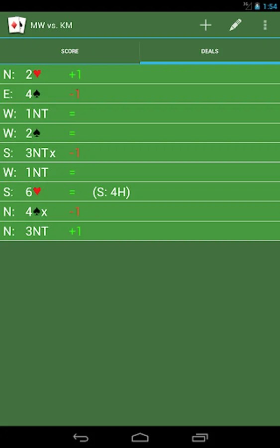 This application allows for scoring points in traditional rubber bridge ("above the line" and "below the line"). Just create a new game and add deals, providing a declarer, a contract, its result, and additional bonuses. The interface is very simple and intuitive, and there is also a help available. The application displays a score sheet in a form of a table. You can also switch to a list view of all deals.