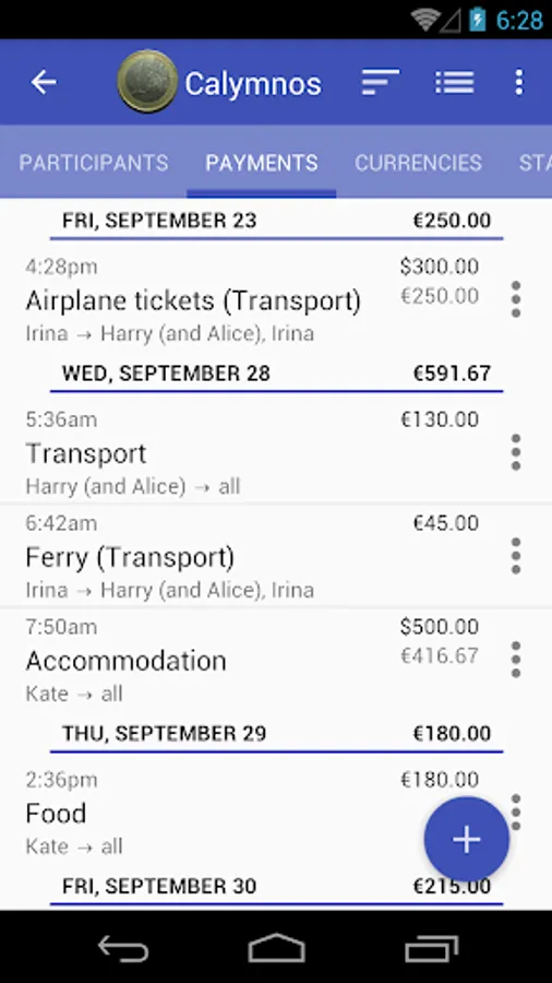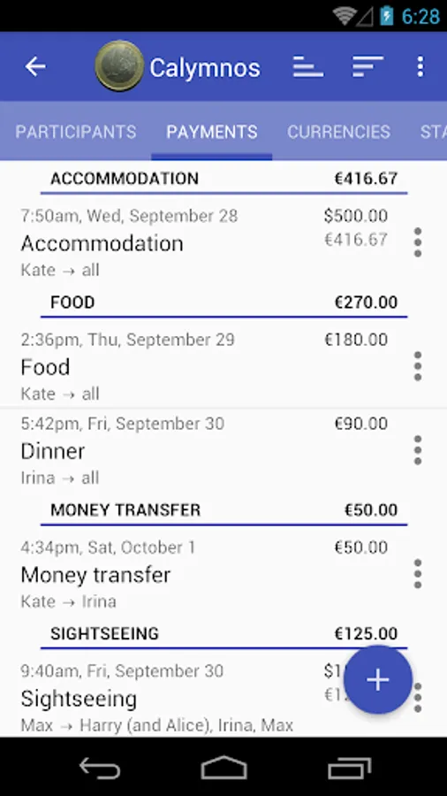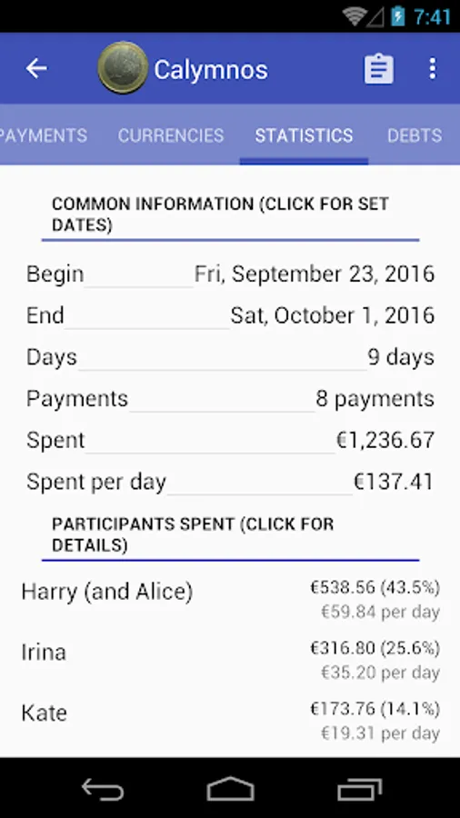 Available detailed report where you can see the costs by category, by the people, by currencies. The report by category can also be viewed for each participant. You can send report to all partivipants via e-mail.
