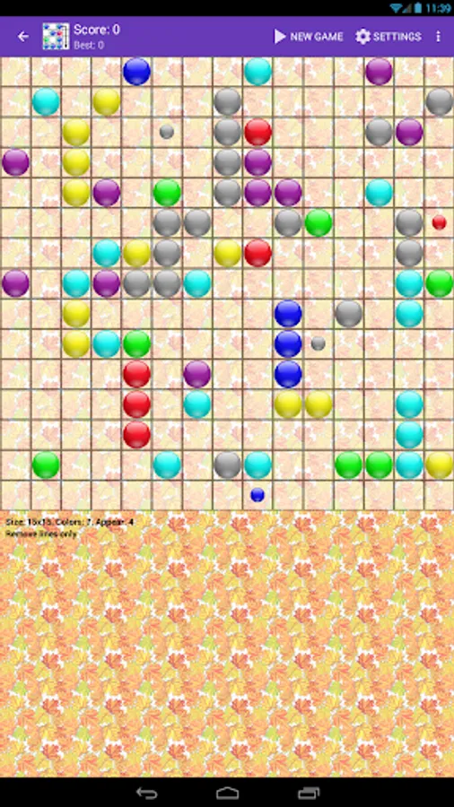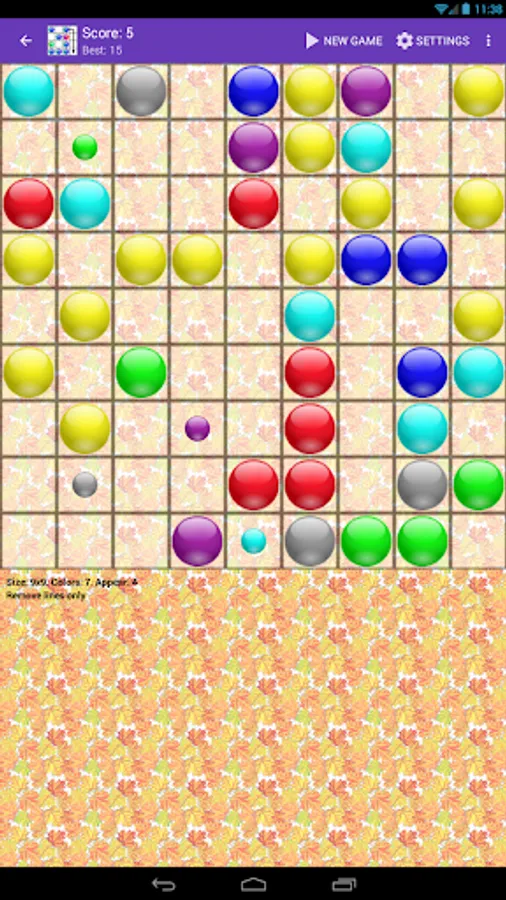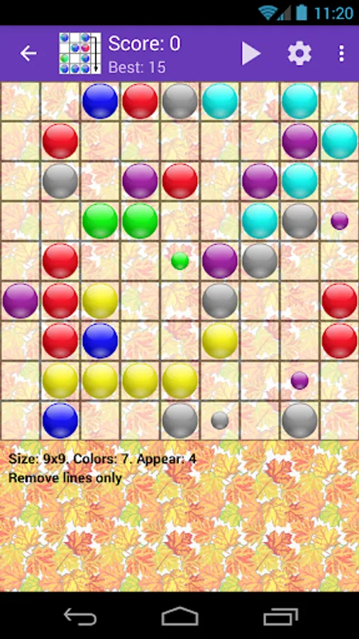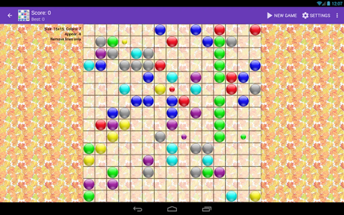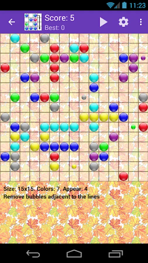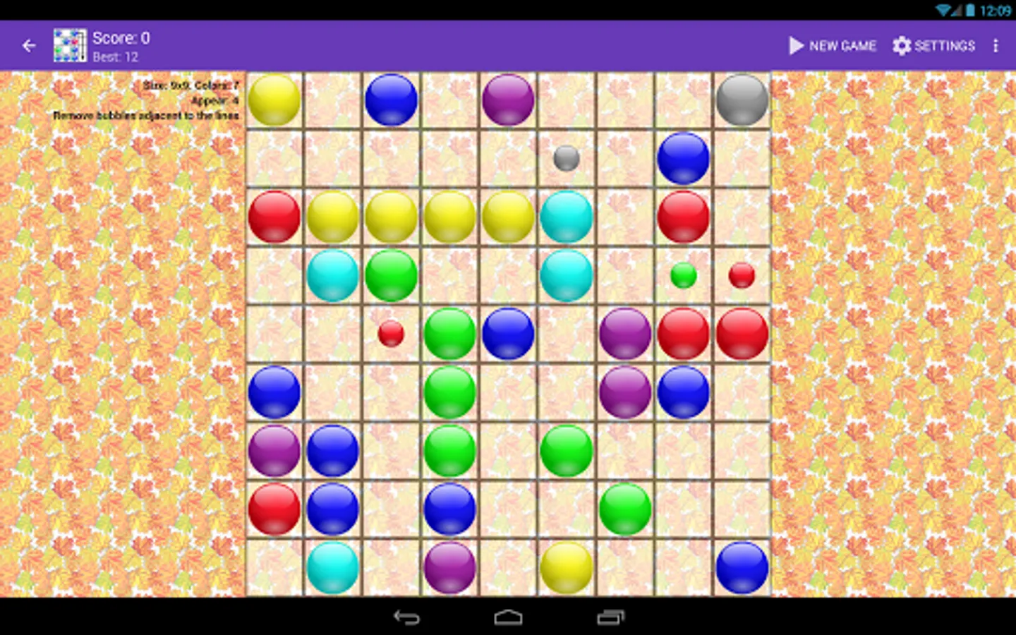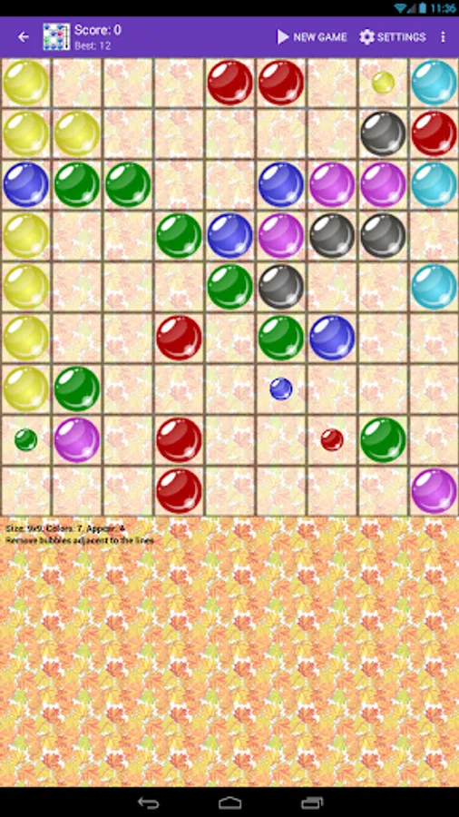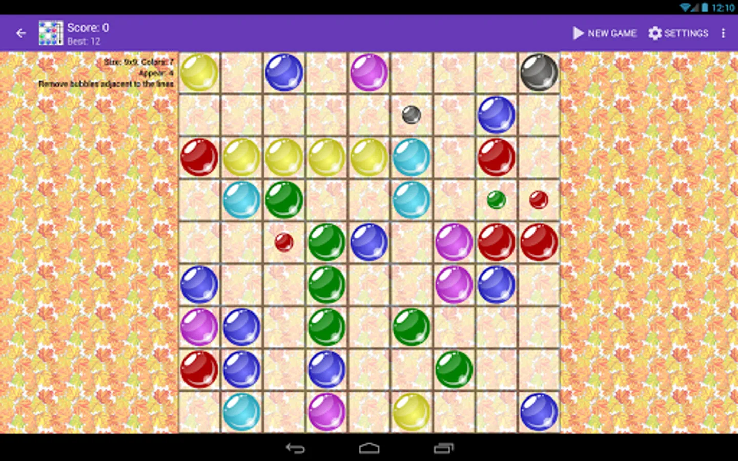The goal — to arrange five or more bubbles of the same color in a line horizontally, vertically or diagonally. Once the line is built, all the bubbles in the line disappear. The more bubbles in a line, the more scores (exponentially). In one move, you must move one bubble. Bubble can only move through empty cells. After each move new bubbles appear.