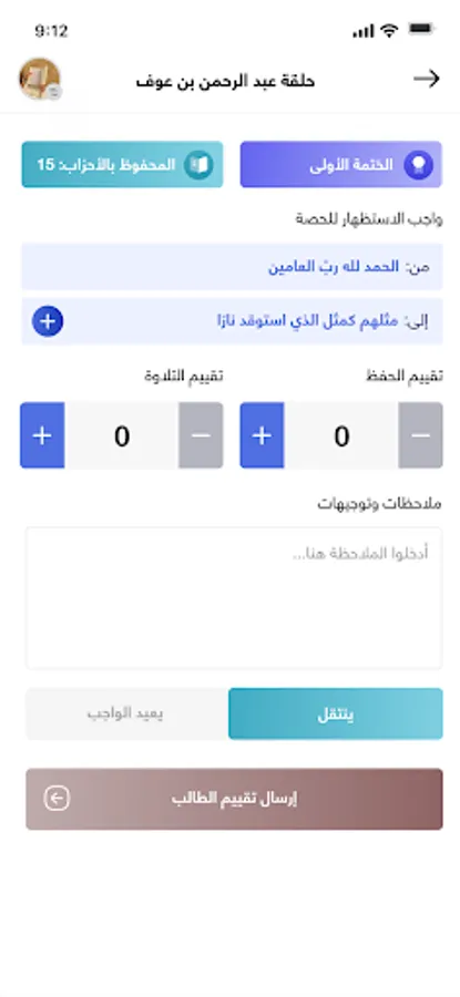 يُتيح هذا التطبيق لمؤطري حلقات المراقي إدخال تقييمات الطلاب والدخول إلى حلقة الاستظهار