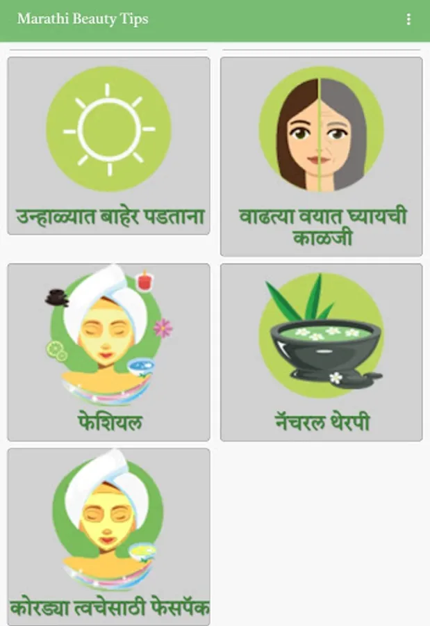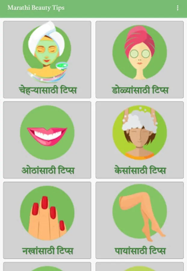 मराठी सौंदर्य टिप्स, खास मराठी लोकांसाठी. हे तुमच्या वैयक्तिक सौंदर्य टिप्स मार्गदर्शक म्हणून कार्य करते. आता तुम्हाला सिंगल क्लिकवर सर्व सौंदर्य टिप्स मिळतील. Marathi Beauty Tips App तुम्हाला तुमच्या शरीराच्या अवयवांची काळजी कशी घ्यावी याचे मार्गदर्शन करेल.