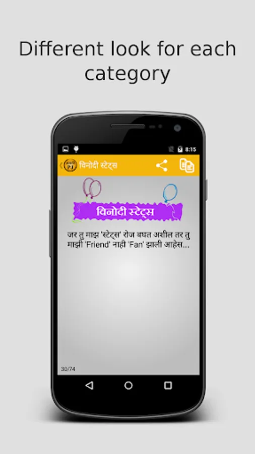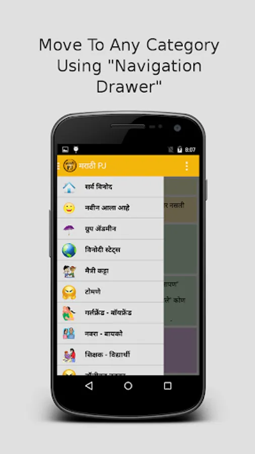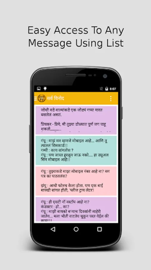 This app contains Largest Collection of Marathi Jokes with 20 Different Categories.