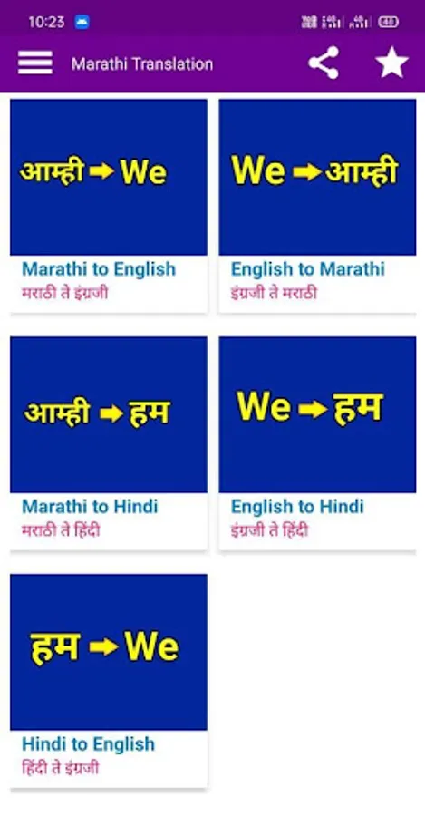 English to Marathi app is very easy to use. It is an English to Marathi Translator and Marathi to Hindi Translator also it is a kind of Marathi Dictionary App. you can quickly convert any Marathi word or sentence to English.