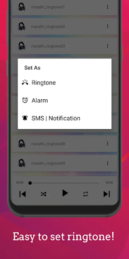 First, you can download this free Marathi Ringtone app, Then you can press the " play " button to listen to the ringtone, and to set it as ringtone click on three-dot(⋮) and choose the ringtone you are done!