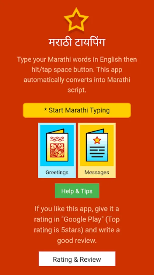 Marathi Typing (Type in Marathi) app is an English to Marathi transliteration tool. Type your Marathi words in English and hit/tap space button. This app automatically converts into Marathi script.