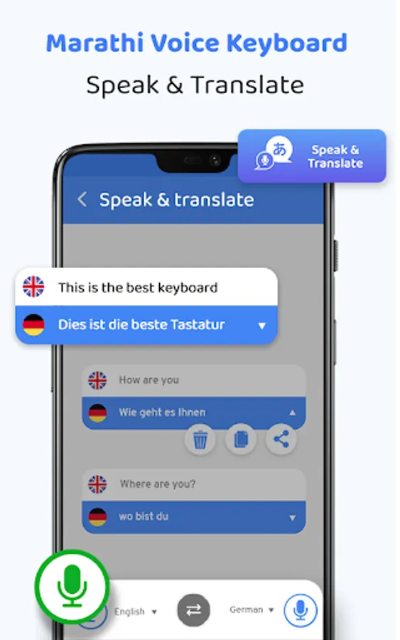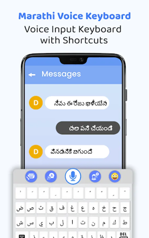 With this voice to text Marathi keyboard, you can send text by your voice as well as by typing to all the messaging application on your phone that supports your default keyboard. Speak to type Marathi keyboard app provides facility to write the text by voice with voice recognition feature and you just have to speak and the app will write it in Marathi language.