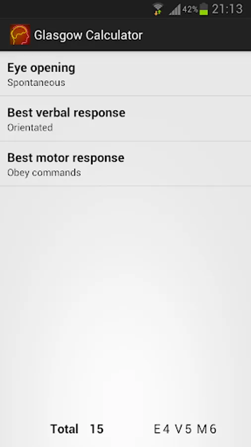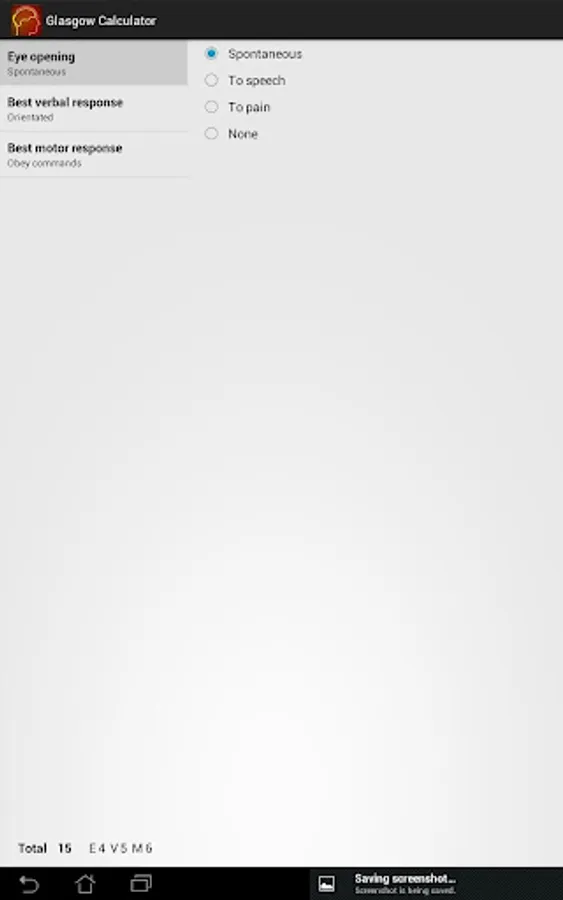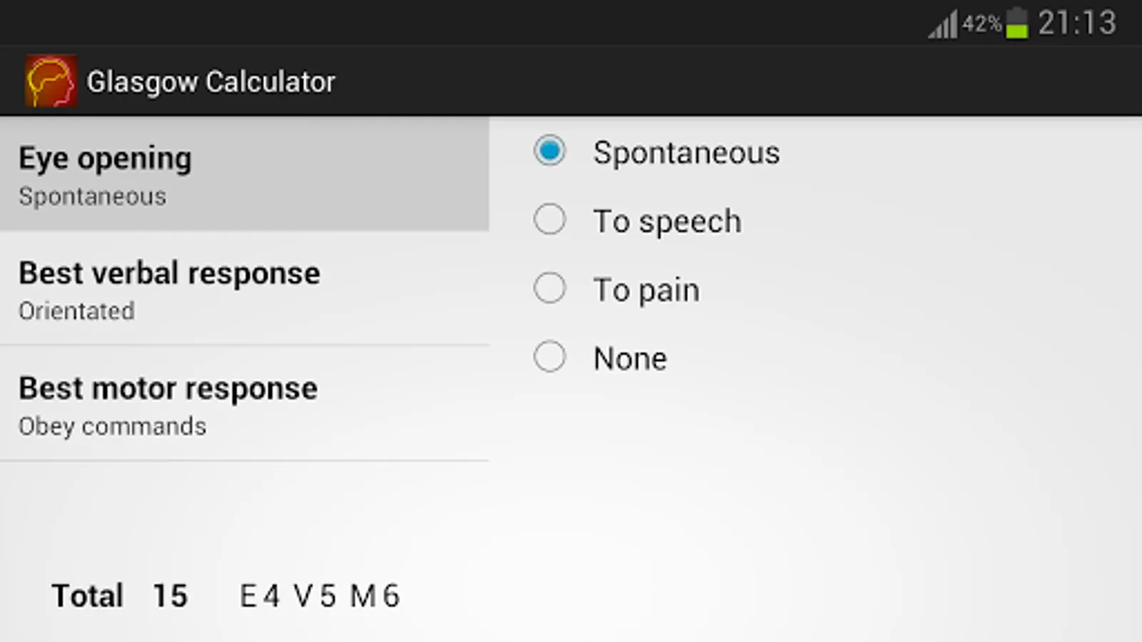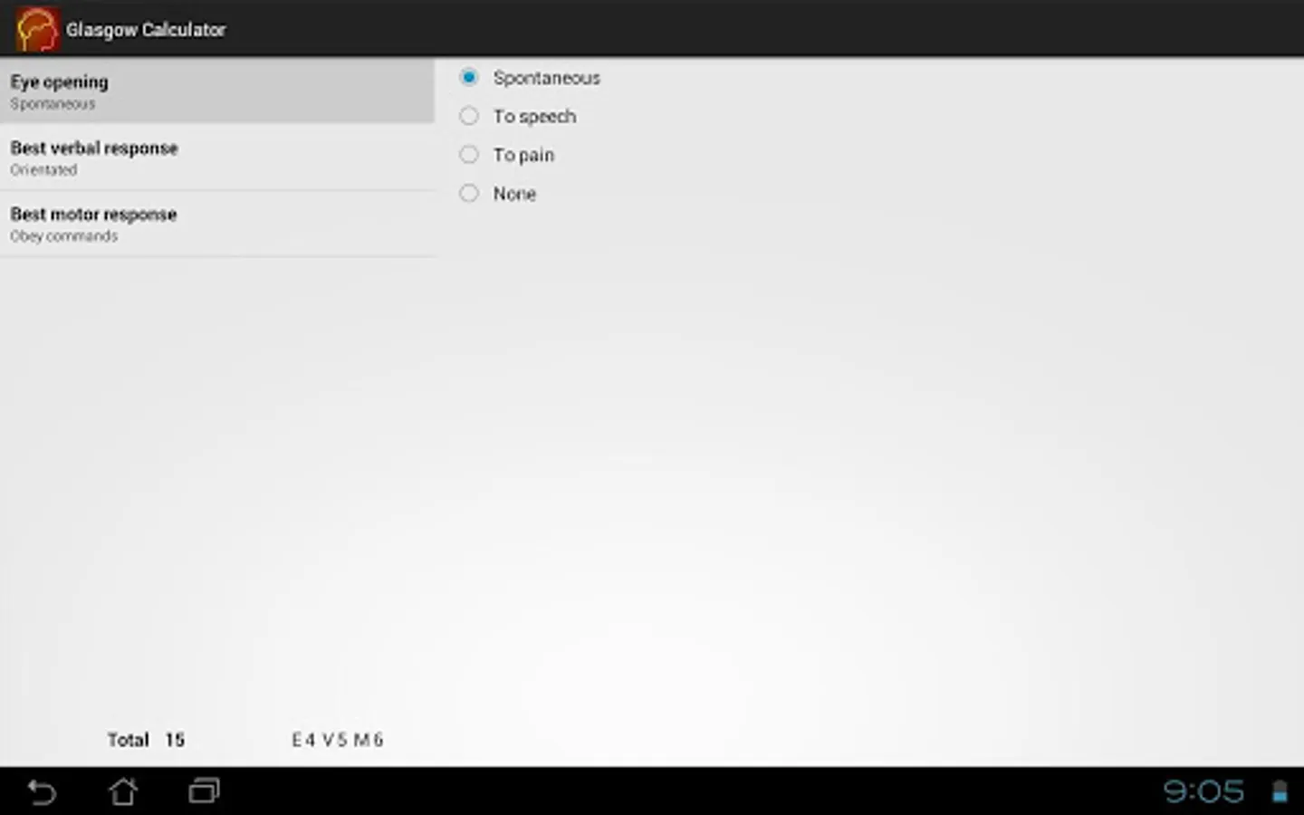 The application works as a calculator for Glasgow Coma Scale. The GCS is a neurological scale that aims to give a reliable, objective way of recording the conscious state of a person for initial as well as subsequent assessment.