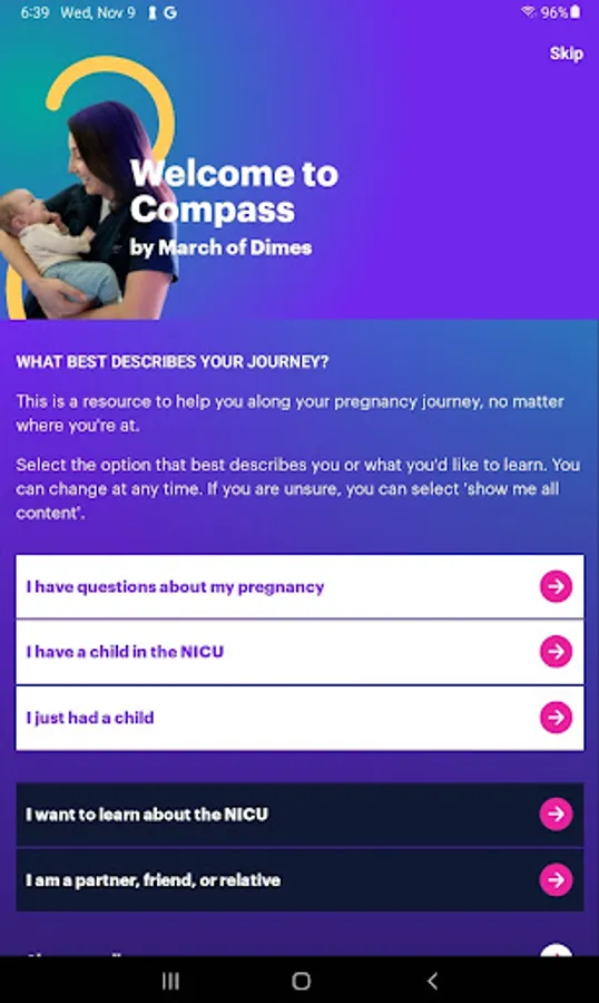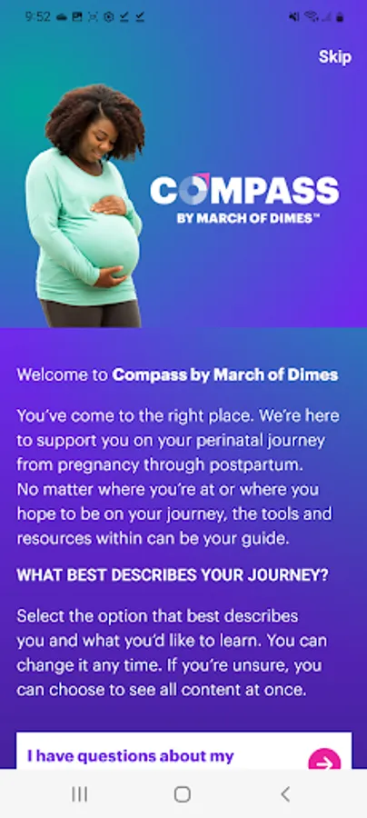 Compass by March of Dimes supports the journey of parents from pregnancy through postpartum by providing answers, resources, and compassion at every step. Use helpful tools like journals and trackers, connect with other parents, and access glossaries, articles fact sheets and more that can help keep you informed along the way.