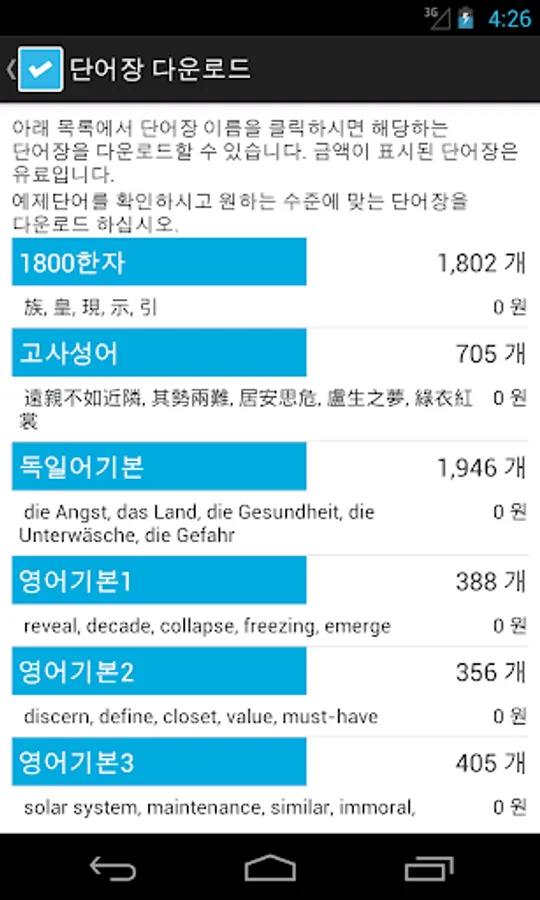 TOEIC, TEPS, TOEFL, GRE, etc. can be a single word in any language study for the exam, English and more than the Japanese, Chinese, etc., including the 1800 German. In addition, you can import the vocabulary he has organized an Excel file in the app.