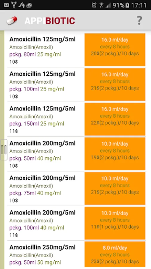 - as a result you see the list of various concentrations and package sizes of drugs containing given antibiotic with the dose information for each drug - daily dose, how often to use and the price of the therapy (depends on the amount of packages)