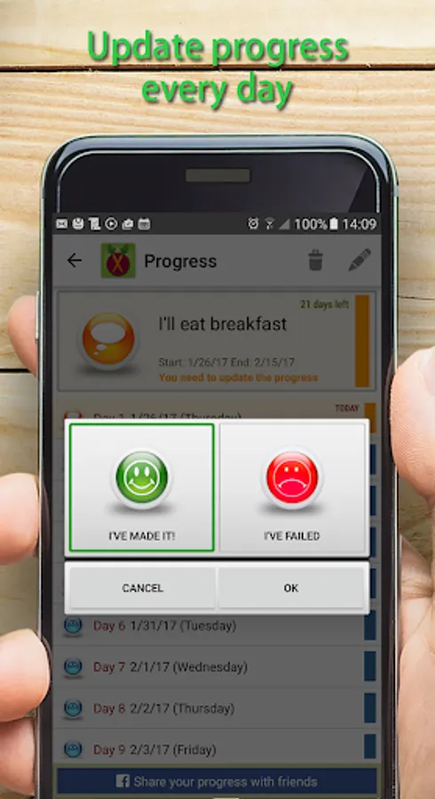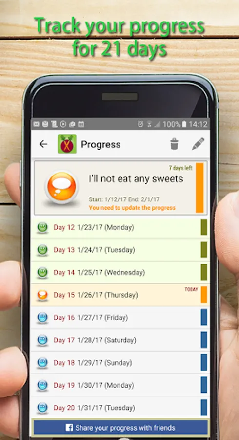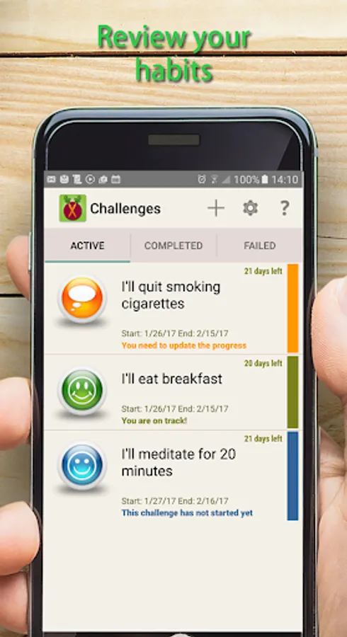 The "21 Days" will help you get rid of bad habits and learn new, good ones.To succeed, you must learn to develop and maintain good habits. You need discipline, courage and hard work to keep those habits for a long time. The theory that the habit is learned in 21 days comes from the book of surgeon Dr. Maxwell Maltz. Repeating the desired behavior for 21 days will make this behavior to become your habit. The application will help you:
