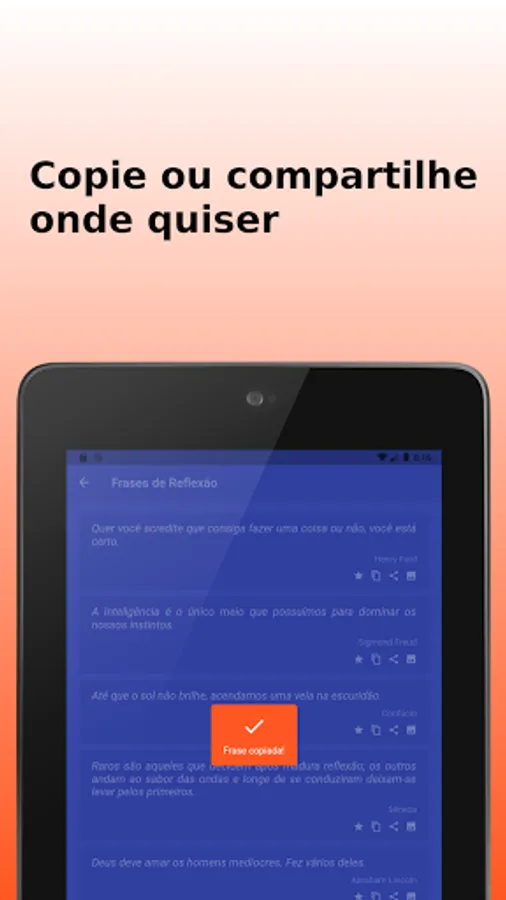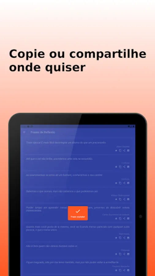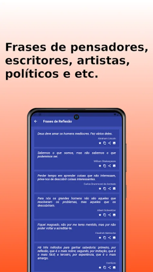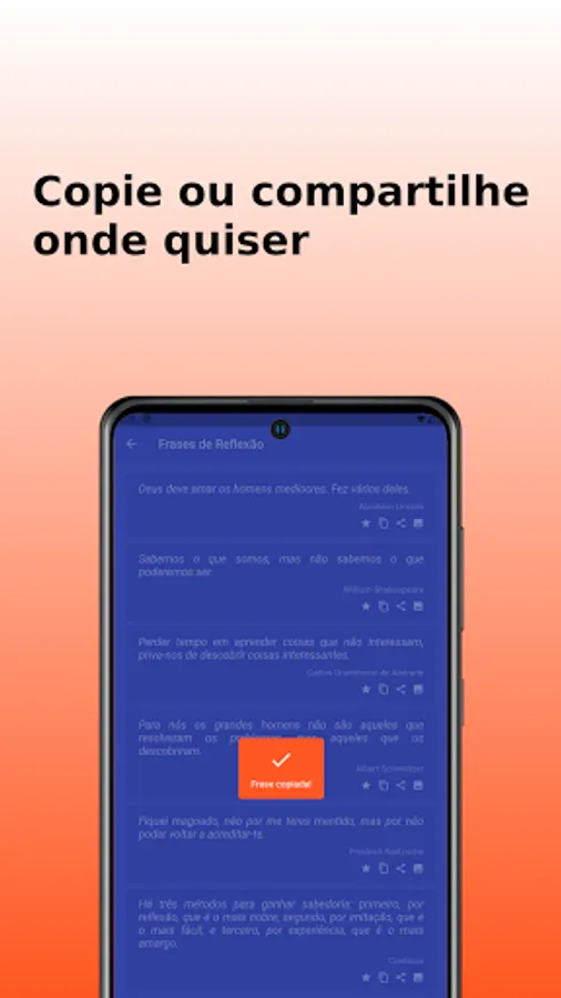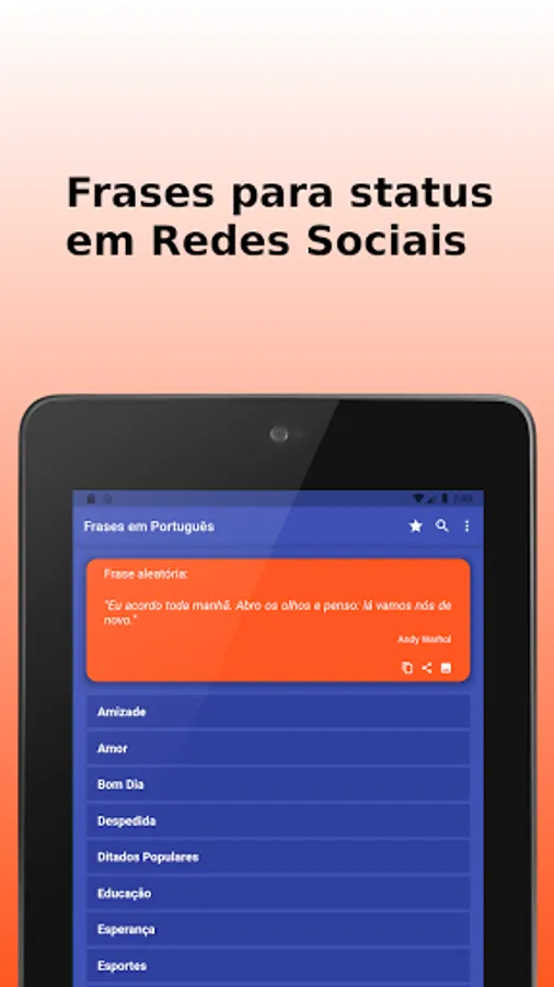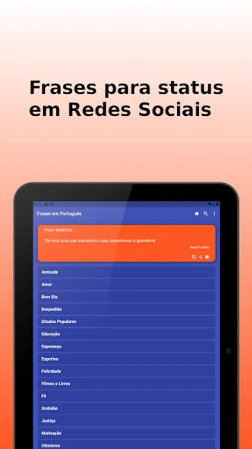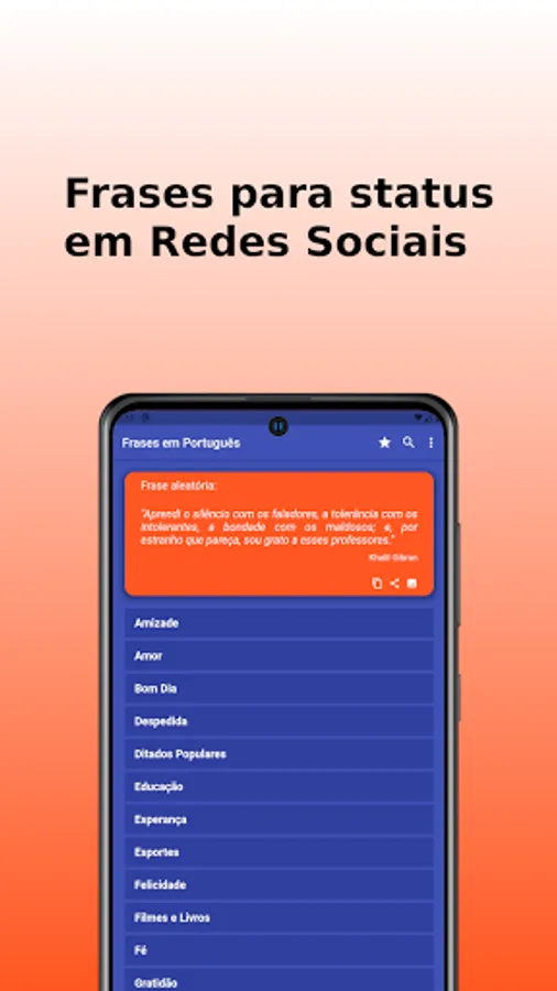 Do you know those times when you want to put a thought, a reflection, or just a sentence in a photo or post? In "Frases em Português" you can easily find what you are looking for, either by looking at the categories or using the search. Always have the best phrase at your fingertips, make it beautiful on Social Networks, such as Instagram, Facebook, WhatsApp, TikTok, Twitter, Kwai, among others. Highlight your posts with deep and striking phrases.