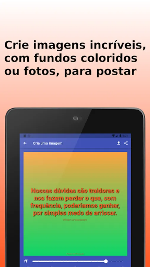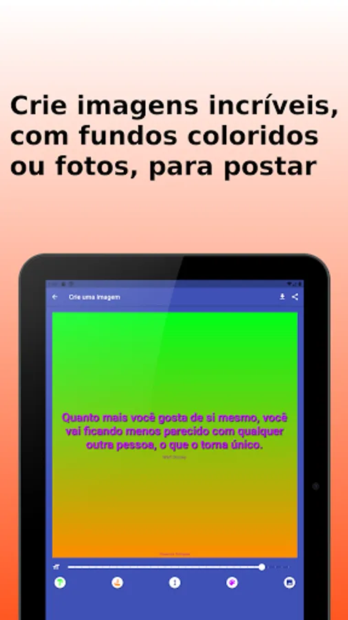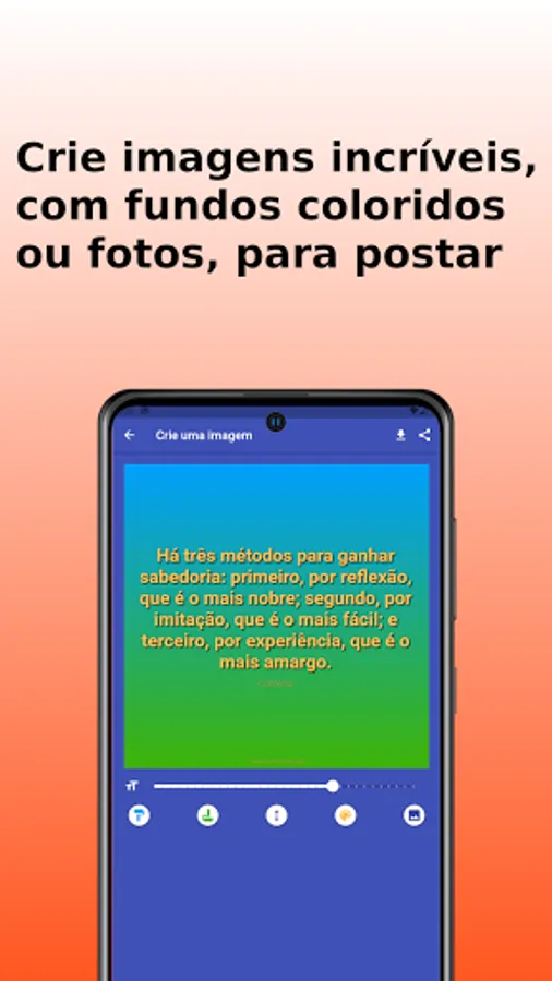 You can also create your own images, personalizing the background with colors or photos, editing the text and the author, changing the size, color and position. Share your creations directly from the app, or save to your gallery for later use.
