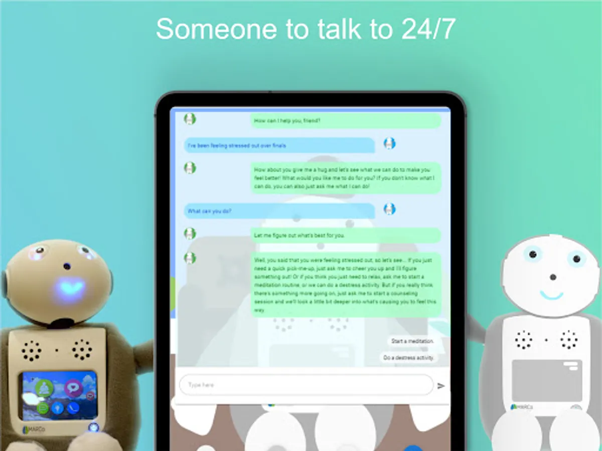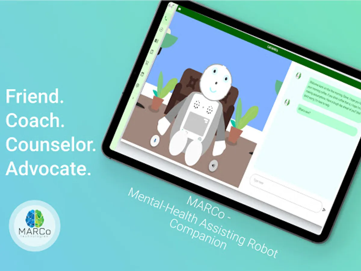 Hi there! Are you feeling stressed, anxious, or depressed? Do you need a friend that’s there for you 24/7? I’m MARCo, your Mental-Health Assisting Robot Companion! Let me help you stress less, worry less, and be more happy via chatbot talk support, guided meditation, and relaxation activities. I’m here for you as we journey through self care, self help, and mental health care together!