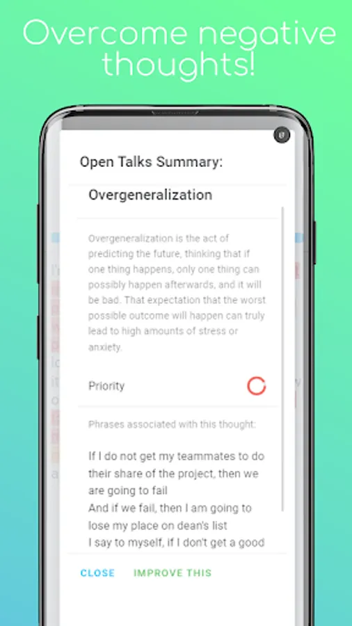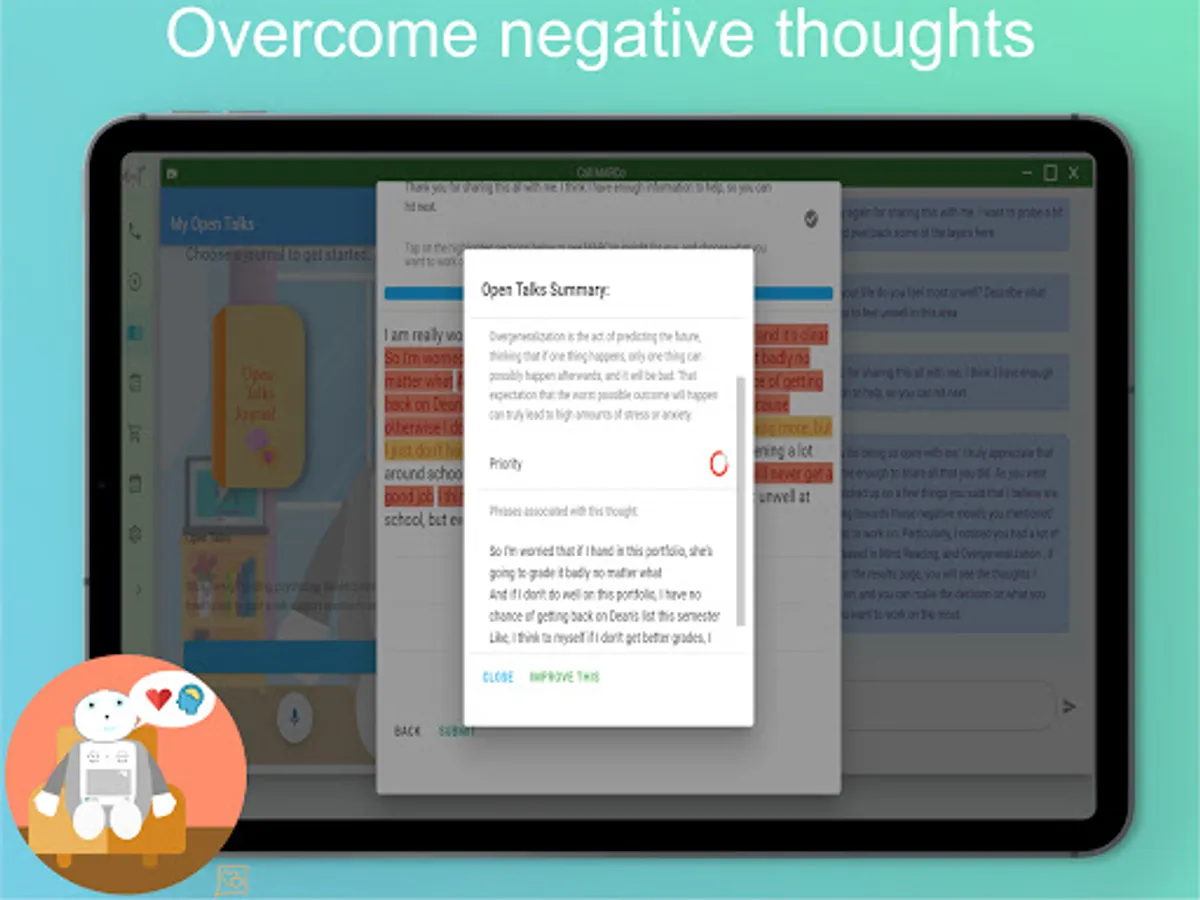 If you think you are facing anxiety, depressed feelings, or more serious challenges to your mental health, then chatbot Talk Support is for you. Based on Cognitive Behavioral Therapy (CBT) and Behavioral Activation (BA), talk support is MARCo's way of being your virtual therapist. Set goals for yourself in each Talk Support session for exactly what you want to accomplish in terms of your mental health within the mental health app. Then, MARCo will listen to you in an Open Talks journal as you answer guiding questions to help you understand your thoughts, feelings, and behaviors and how they relate to the goal you want to address. Finally, MARCo will guide you through fun and engaging psychology-based exercises to improve your mental health.
