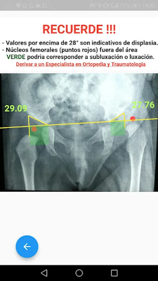 The objective of the application is to provide the marking and tracing of the angles in the pelvic AP radiography obtained and finally to provide a measurement and guidelines that can help in the early and opportune diagnosis of the Hip Development Dysplasia, subluxation and / or dislocation